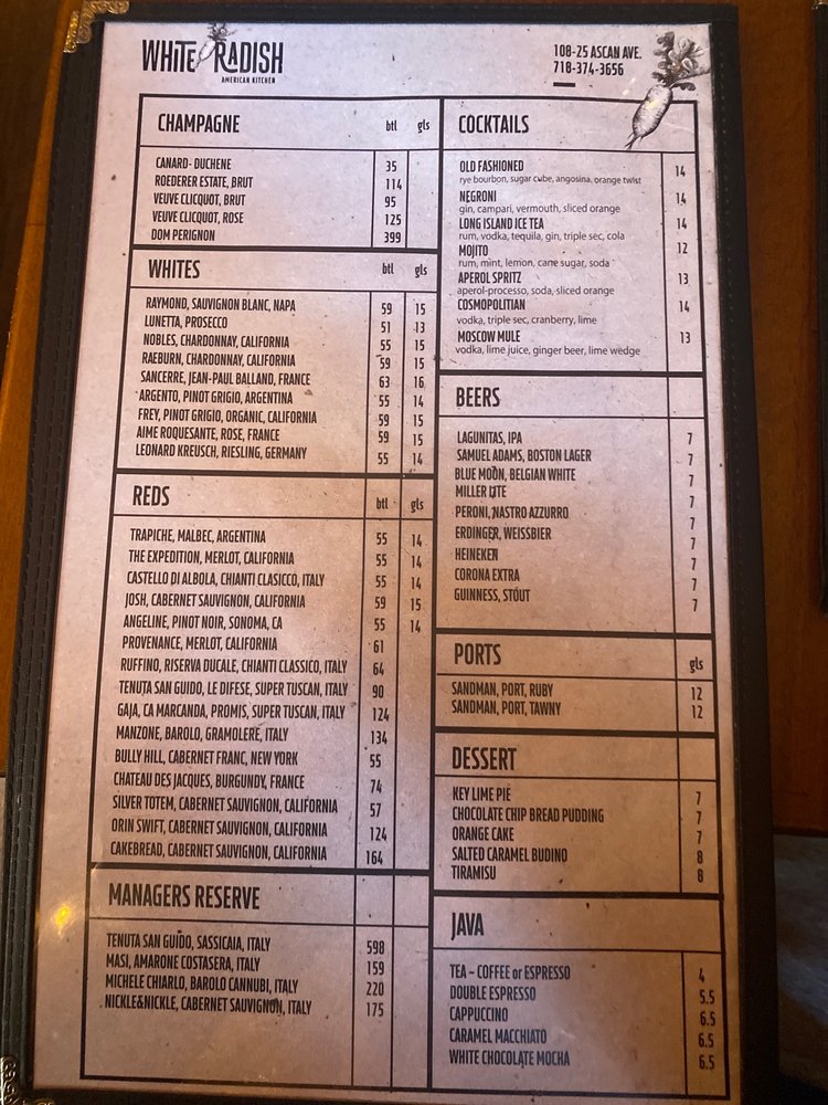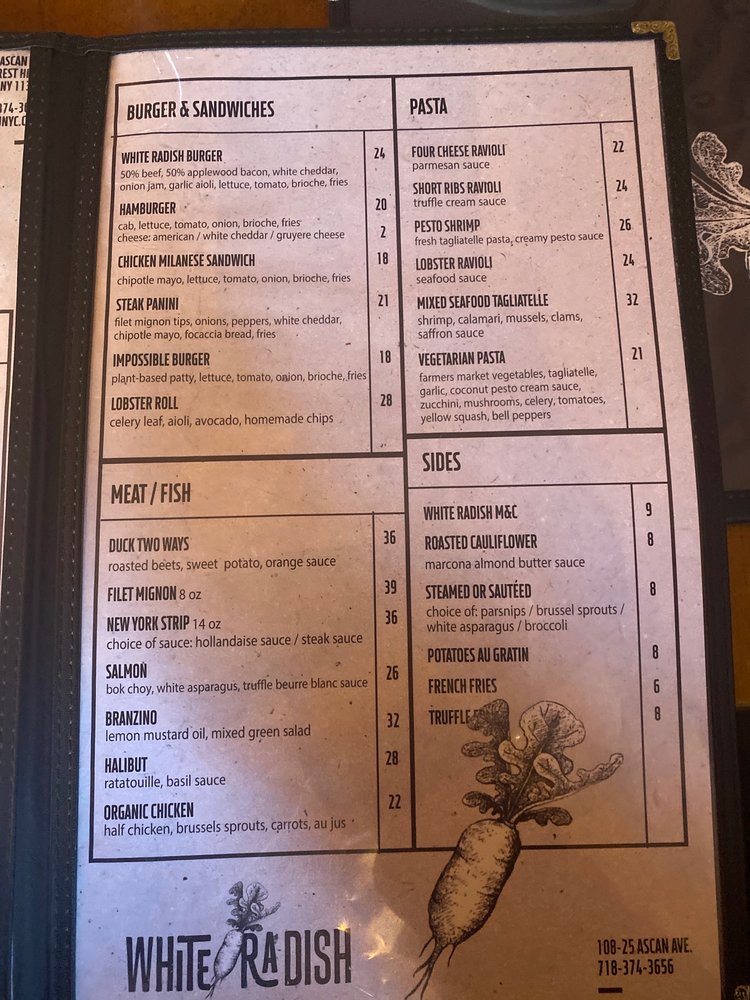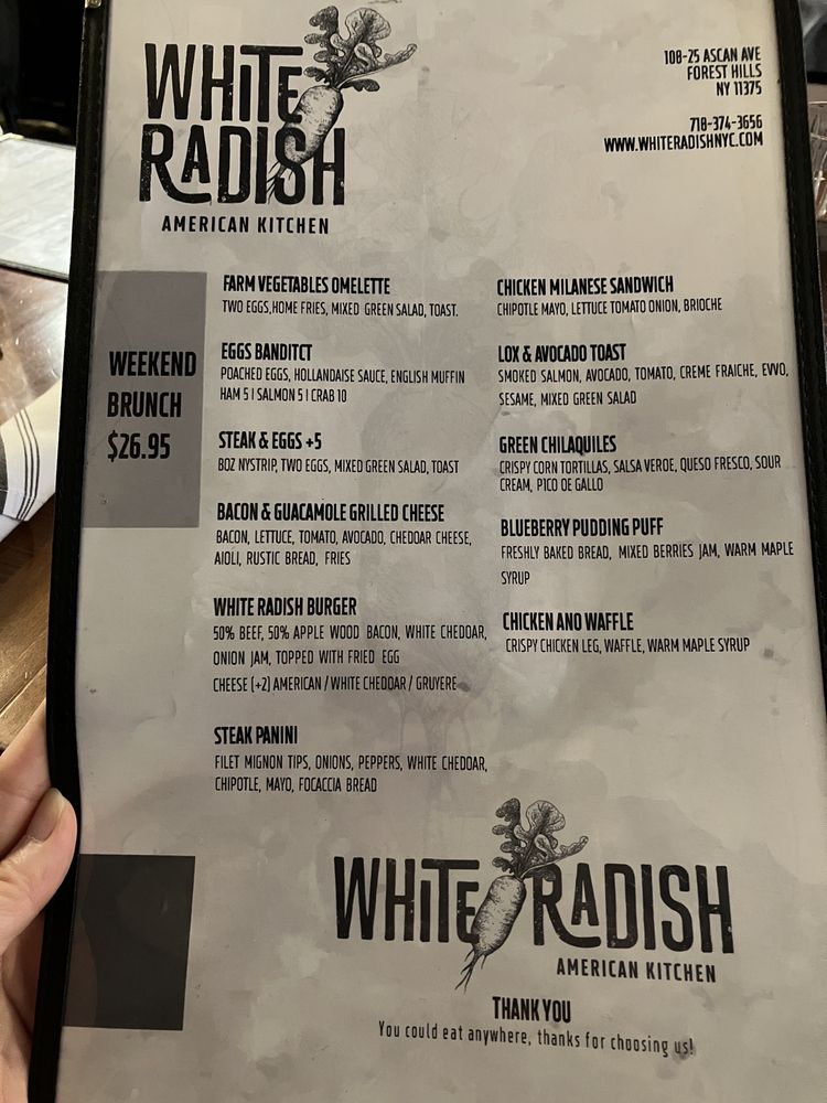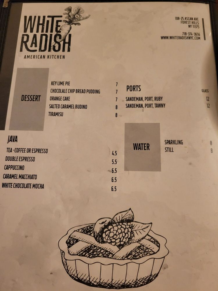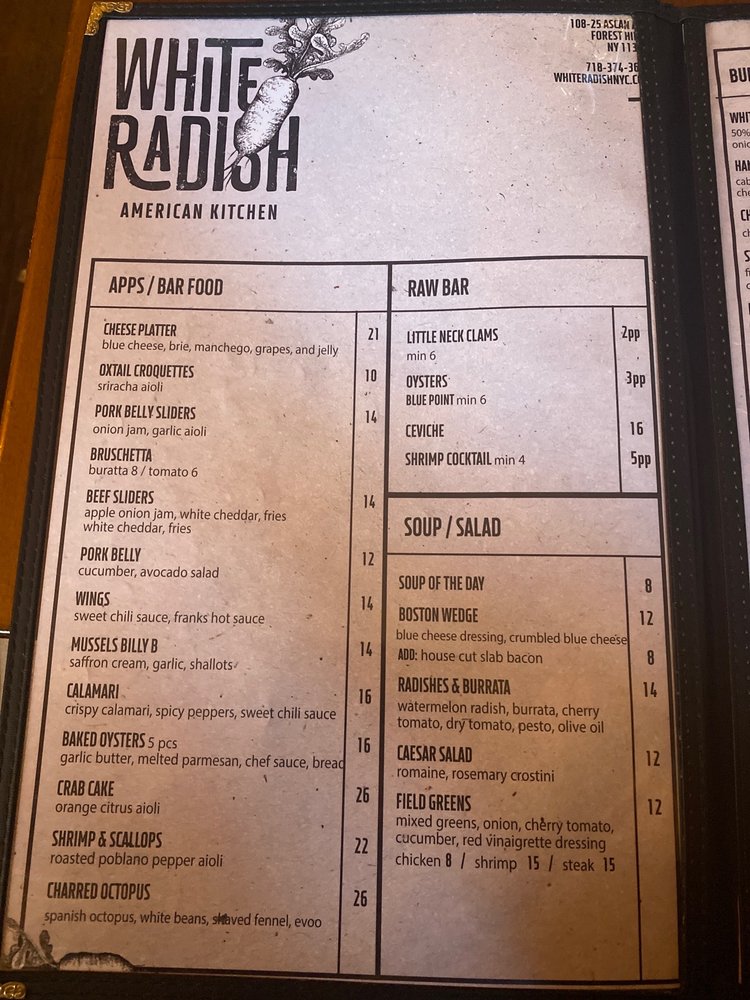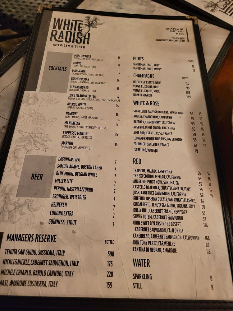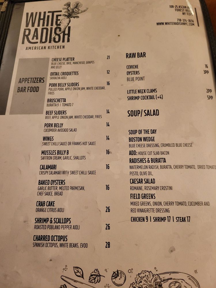 Welcome to White Radish, a delightful addition to the New American diner scene located in the heart of Forest Hills. This inviting space combines casual elegance with a rich menu brimming with culinary creativity. Whether you're drawn in for brunch or a cozy dinner, White Radish offers a versatile dining experience, including an array of vegan and vegetarian options.